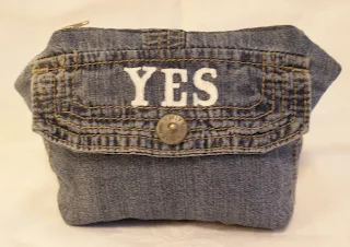 Denne er sydd av en gammel dongeribukse. Vintagebilde fra Sagen Vingage Design er strøket over på eget tøy og sydd på etterpå.Swarovskiperler ogtøyblomst er limt på, og metallsommerfugel er nestet på litt under blomsten. Her er også brukt sjablong og tekstilpenn til å skrive med.